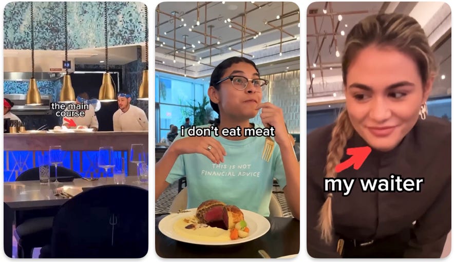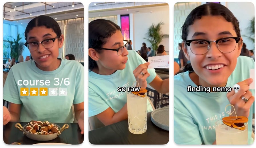 Not sure if Jenny did this on purpose, but she opened the short by saying “a 6-course meal”, so the addition of drinks, service, and the human component (Alexa the waitress) keeps things unexpectedly fresh.