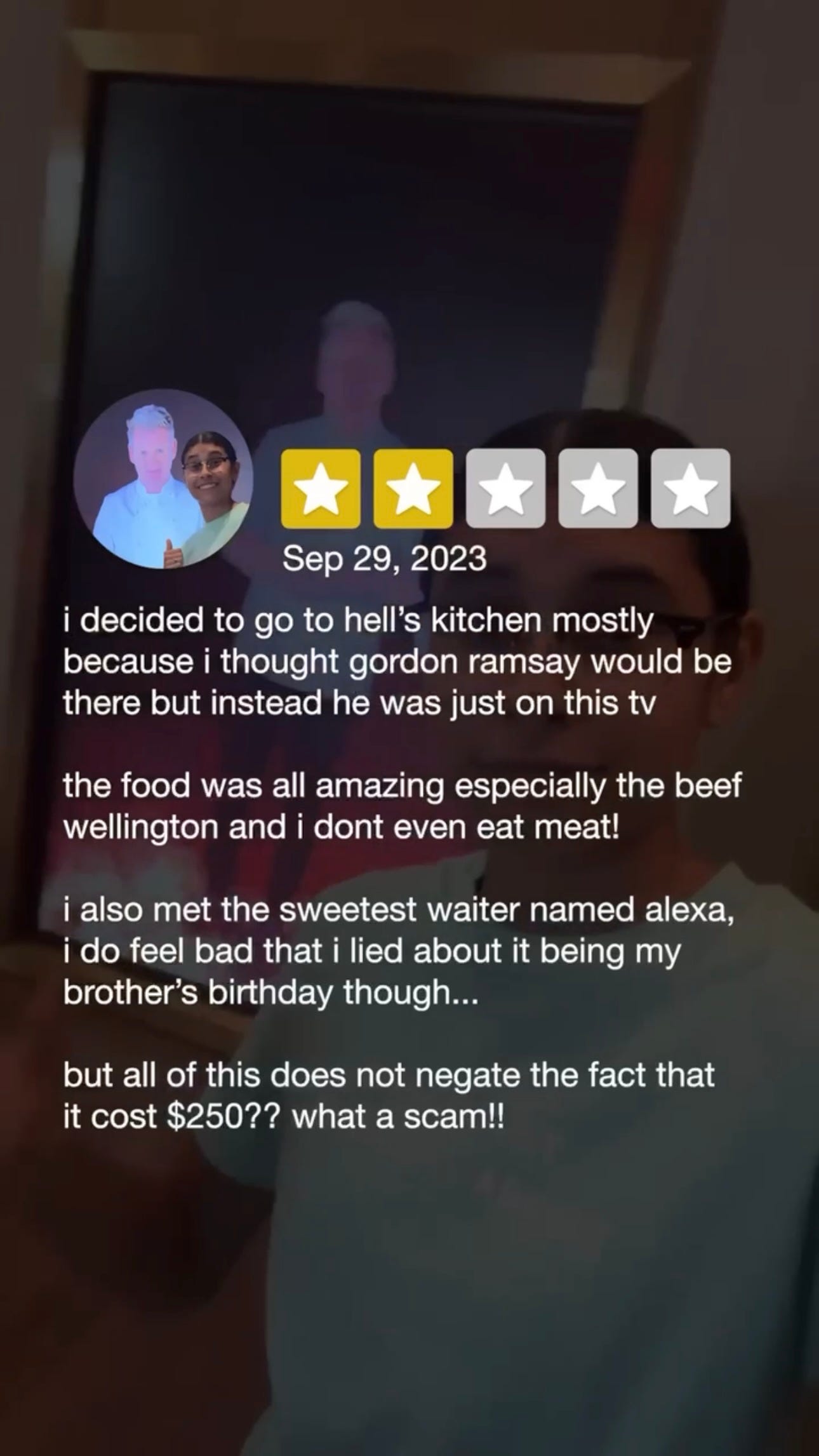 V.O: “To finish off the night, I lied about my brother's birthday to get free dessert, which tasted like heaven despite being from Hell’s Kitchen.”