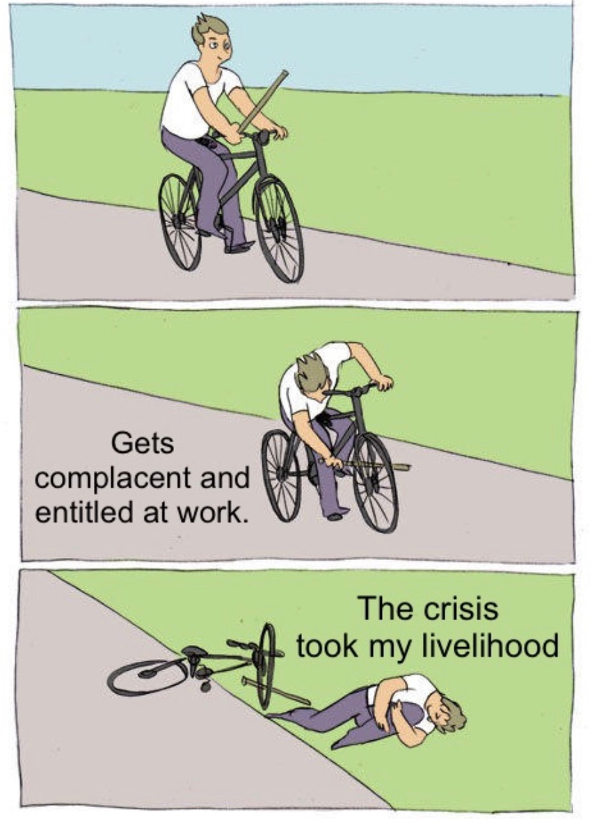 Bummer, guys. We gotta let you go. The market is crashing. We're cutting staff down.